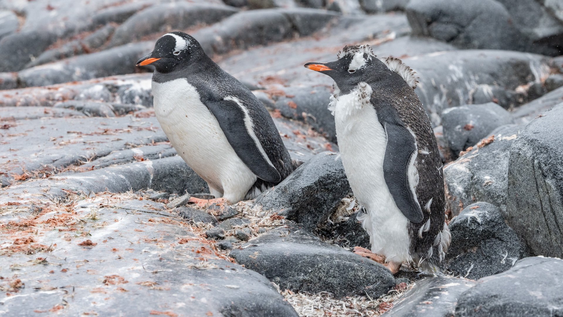 Penguins: Chicks start to moult, losing their down before heading to sea.