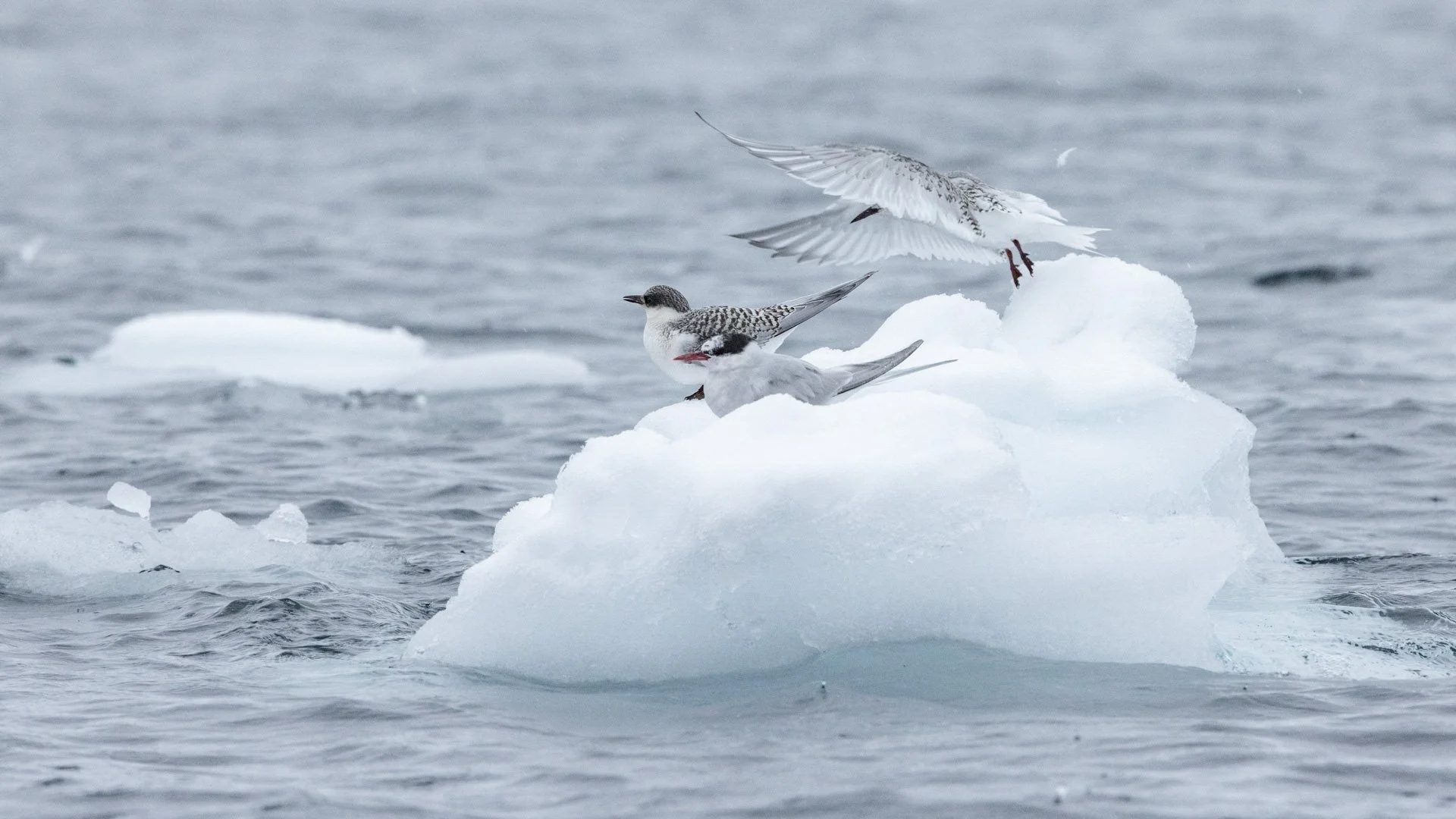 Birds: Skua and sheathbills swoop overhead, opportunistic and bold; Cape petrels swirl around the ship; snow petrels appear ghostlike against ice, and both Arctic terns and Antarctic terns rest on ice floes between feeding flights.